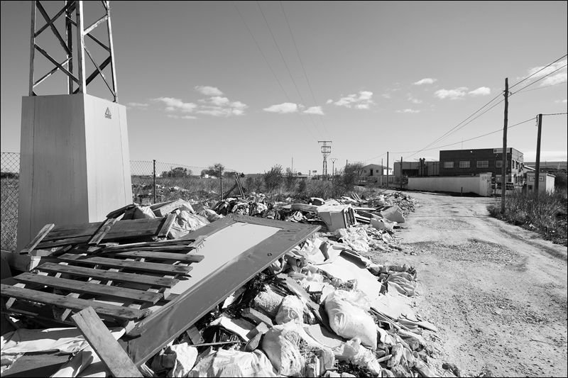 Decadencia y abandono se hacen patentes en polígonos industriales, almacenes, infraviviendas, infraestructuras, caminos intransitables y linderos. La degradación ambiental se nos muestra en la proliferación de vertederos incontrolados, obras inacabadas, arroyos contaminados y vandalismo por doquier.