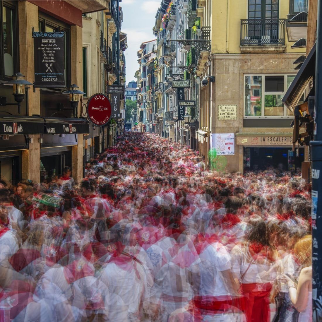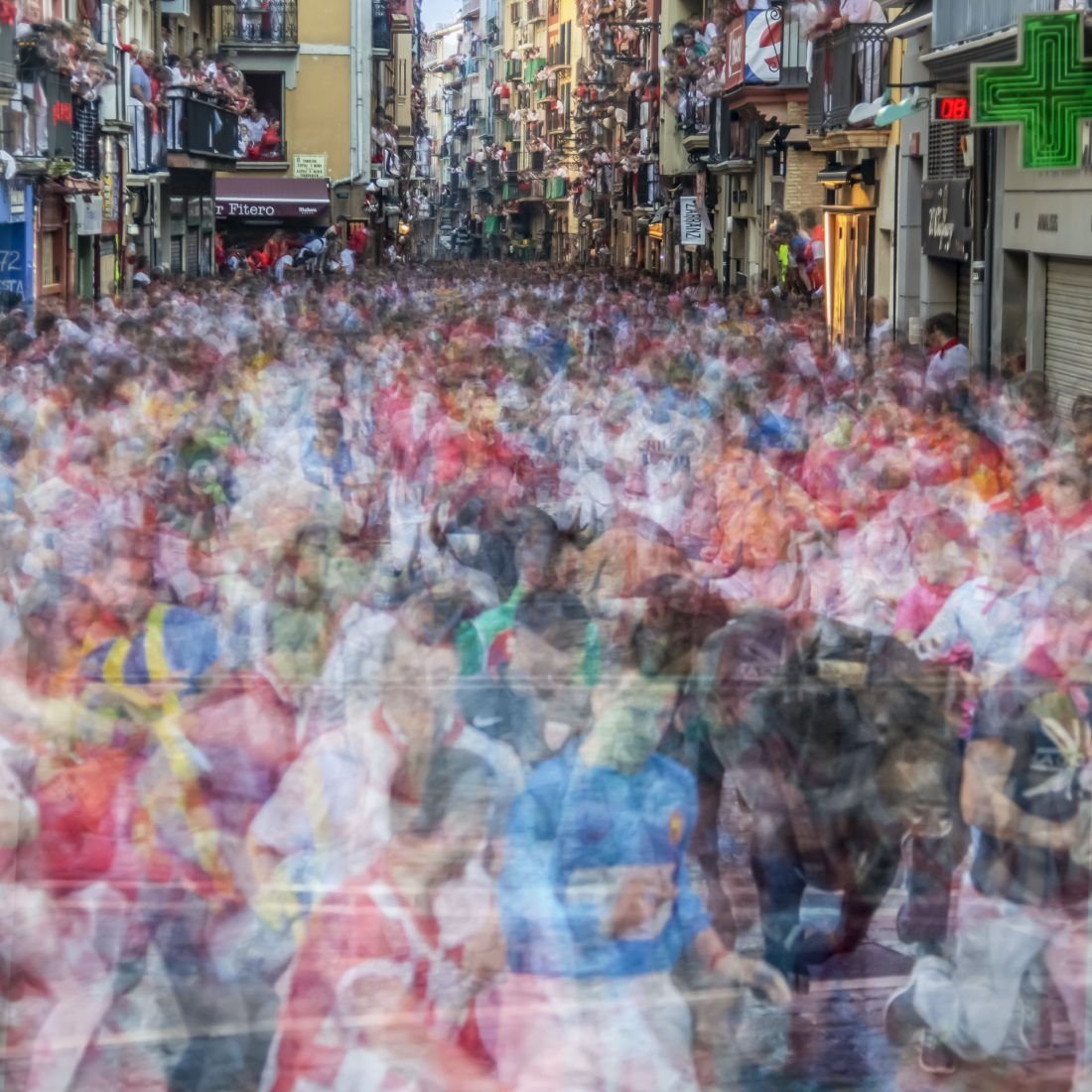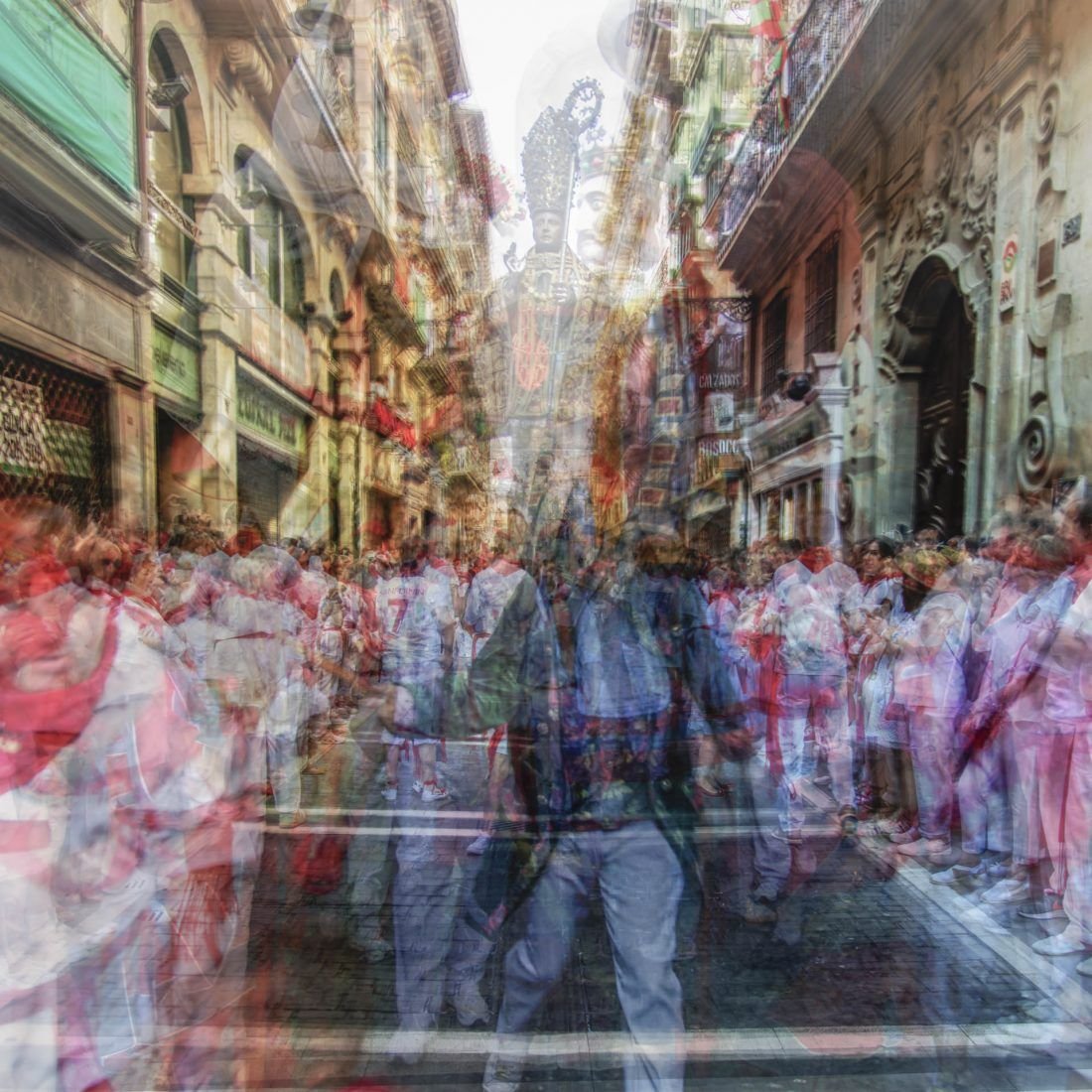 Tránsito San Fermín es una ampliación temática de la serie Tránsito. Pamplona se transforma durante sus fiestas mostrando un imparable tránsito de personas venidas de todo el mundo, reflejada de forma única en la obra. Serie galardonada con un premio LUX a mejor proyecto personal.