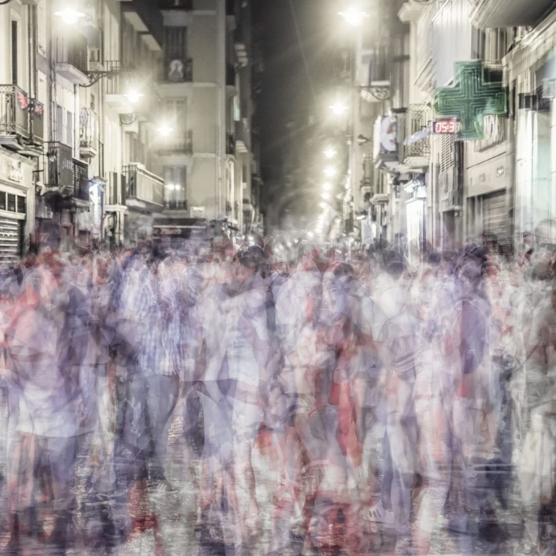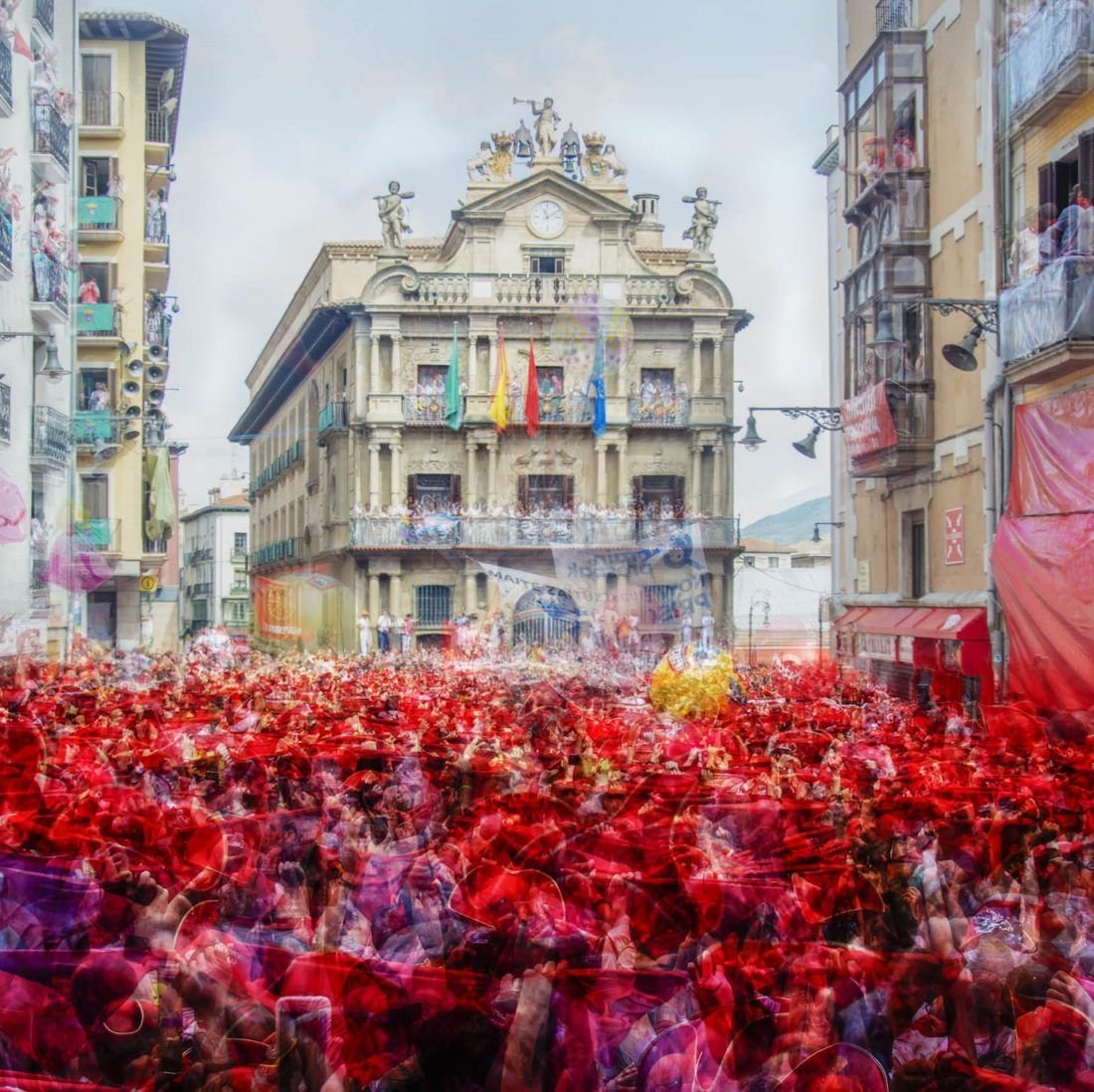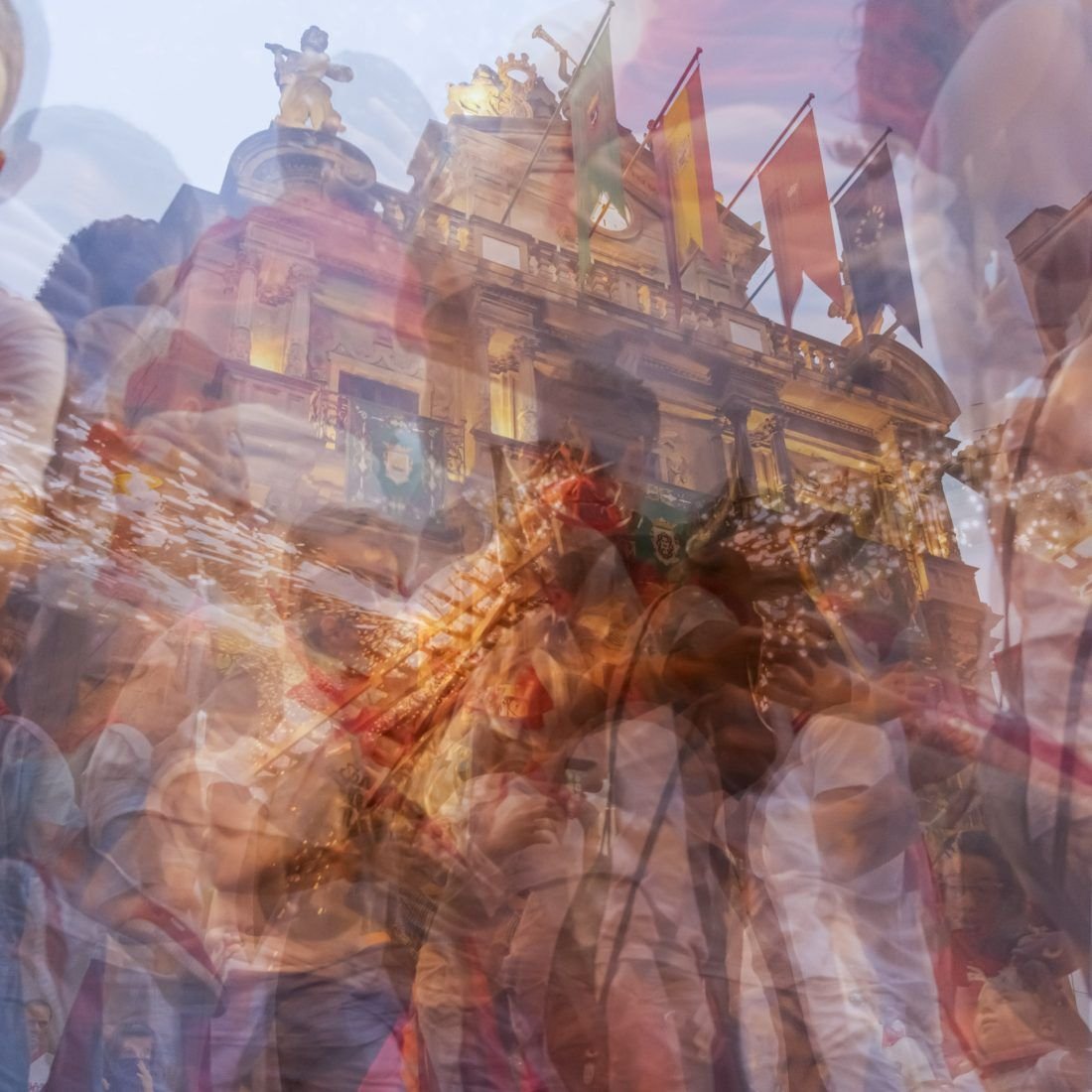 Tránsito San Fermín es una ampliación temática de la serie Tránsito. Pamplona se transforma durante sus fiestas mostrando un imparable tránsito de personas venidas de todo el mundo, reflejada de forma única en la obra. Serie galardonada con un premio LUX a mejor proyecto personal.
